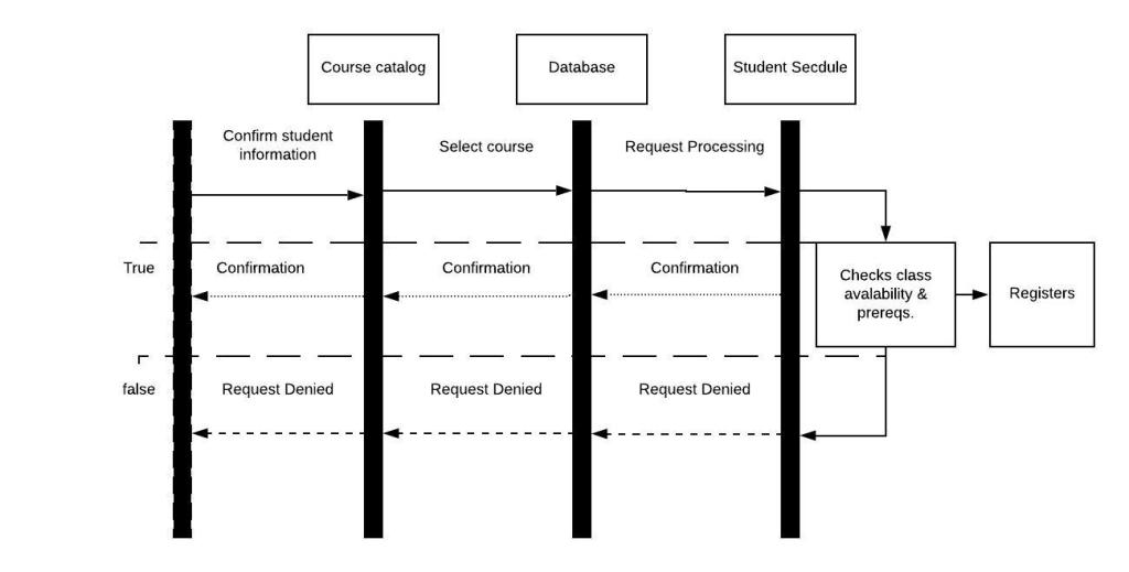 5.5. Develop a sequence diagram showing the interactions involved when a student registers for a course in a university. Courses may have limited enrollment, so the registration process must include checks that places are available. Assume that the student accesses an electronic course catalog to find out about available courses.